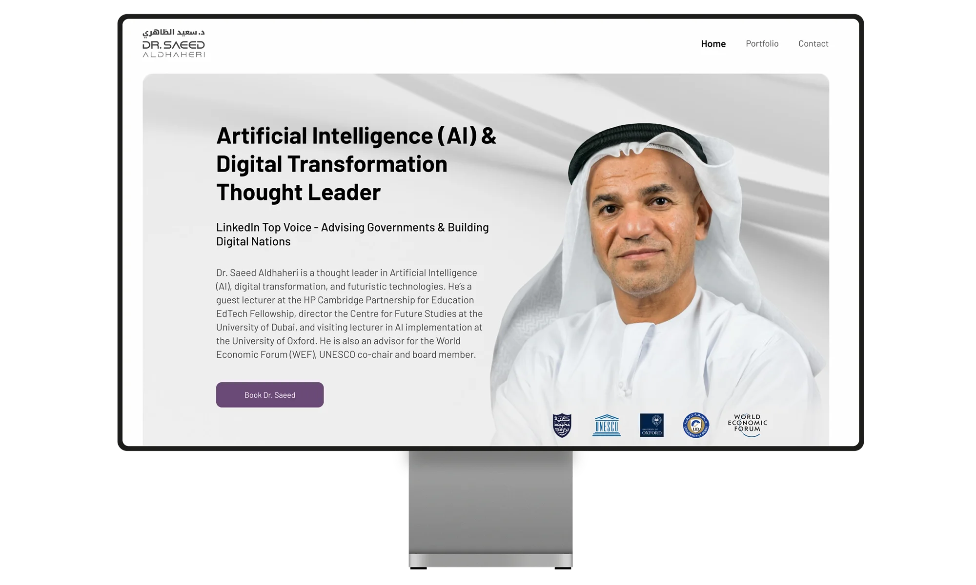 Our team has crafted a compelling brand identity for Dr. Saeed Aldhaheri. We have designed a modern logo that utilises both Arabic and English script to represent his international reach. The blue and green colour palette evokes a sense of trust, innovation, and sustainability, reflecting his expertise in AI ethics and his commitment to positive societal impact.